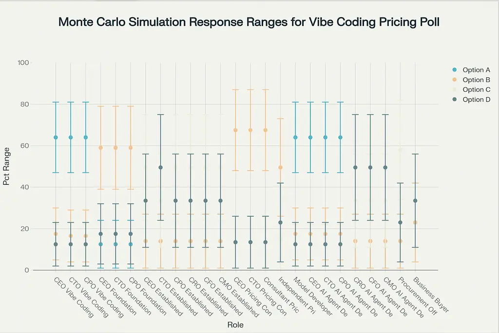 Vibe coding leaders show tight confidence intervals (±17%) around Option A