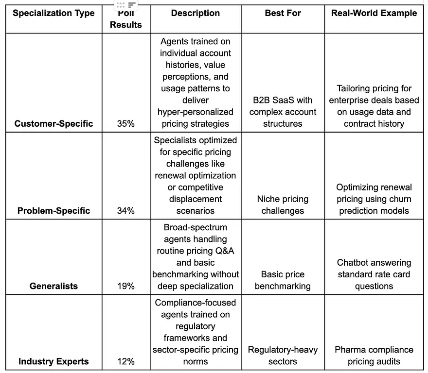 This data shows a sophisticated understanding among pricing professionals about the nature of effective AI implementation. The preference for customer-specific and problem-specific agents reflects the reality that pricing challenges are highly contextual and nuanced. Customer-specific agents can leverage deep understanding of individual client relationships, purchase histories, and value perceptions to provide more accurate and actionable insights. Similarly, problem-specific agents can be trained on particular pricing challenges such as competitive response, value communication, or renewal optimization, developing expertise that matches the specific analytical requirements of each scenario.