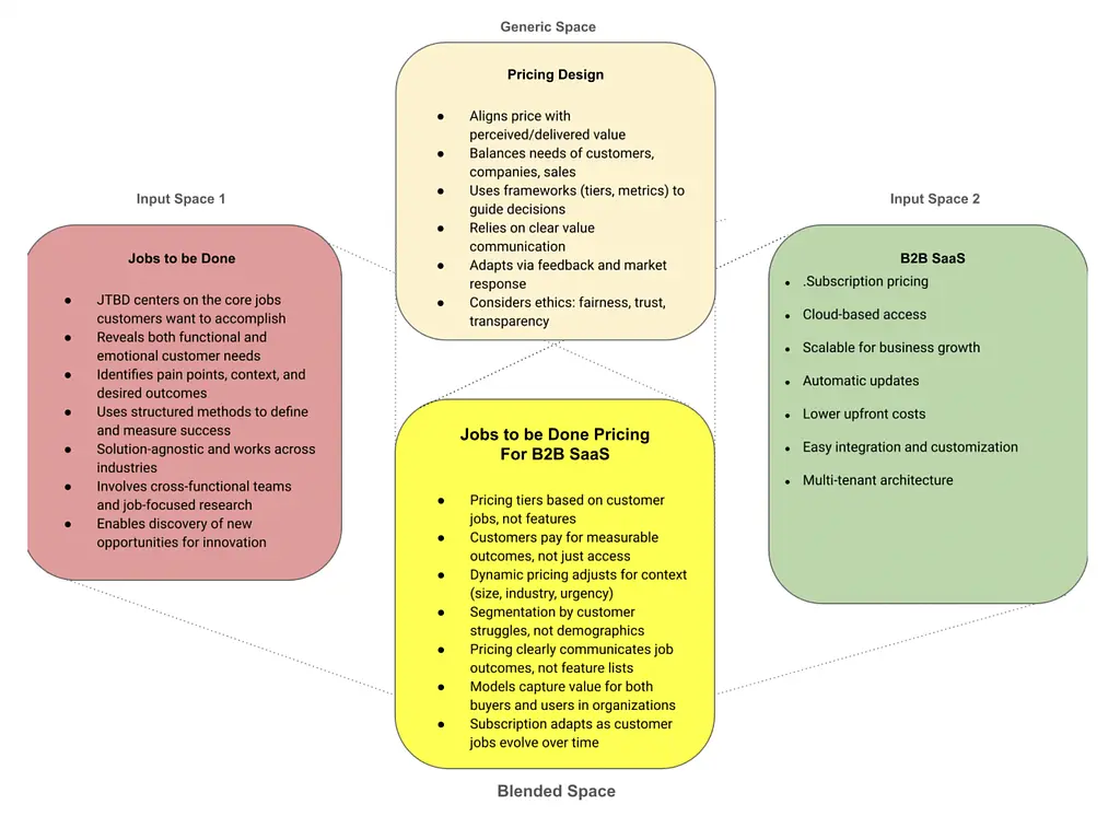 The basic framework for a concept blend has a generic space and two input spaces. In our case, the generic space is pricing design, and the input spaces are Jobs to be Done and B2B SaaS or AI Agents. We chose to generate blends on both B2B SaaS and AI agents so that we can compare B2B SaaS pricing with AI agent pricing.