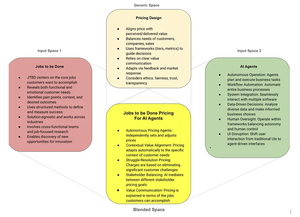 We begin with the generic space of pricing design, and then use the input spaces of Jobs to be Done and AI Agents to generate ideas for pricing AI agents.