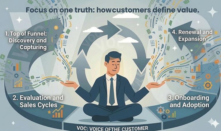In high-growth B2B markets, your Voice of Customer (VoC) program is your competitive advantage. Too often, VoC is used to summarize sentiment instead of steering decision velocity. When embedded across every stage of your go‑to‑market and revenue operations, it becomes a compounding asset that aligns product, pricing, and customer success around one truth: how customers define value. 1. Top of Funnel: Discovery and Capturing Actions:Capture “first contact” language from inbound forms, chat, and early calls to understand what triggered their search and how they name the problem they are looking to solve.Use this language to tune your website, content, and AEO so both humans and buyer agents can quickly match your offer to their intent.By capturing and analyzing this content, you can see subtle shifts in phrasing and terminology that indicate that the goals and needs, the jobs-to-be-done of potential buyers is changing. By tuning site copy to that precise language, you can team improved qualified traffic and inbound conversions. 2. Evaluation and Sales CyclesActions:Instrument discovery calls and product demonstrations to capture jobs‑to‑be‑done, alternatives considered, and decision criteria; this becomes input to value models and sales playbooks.Feed patterns from wins and losses back into segmentation, qualification, and pricing guidance, so sales is not improvising value stories deal by deal.Gartner and others have quantified the impact of rigorous win–loss analysis: teams that take a comprehensive approach can see 15–30% revenue uplift and up to a 50% improvement in win rates. (1)3. Onboarding and AdoptionActions:Use early‑stage feedback to discover what actually unlocks first value and where customers stall; this informs packaging, in‑product guidance, and premium services.Cluster customers by real adoption patterns, not just company size or annual recurring revenue, and use that to refine both pricing tiers and expansion plays.Userpilot’s work on SaaS renewals highlights how product teams analyze feature‑usage data to understand where customers stall after onboarding. This data also reveals which behaviors correlate with long‑term retention and expansion. When you cluster customers by real adoption patterns, you get sharper inputs for packaging (which capabilities belong in which tier), product enhancements, and where your customer success teams should intervene with high‑touch support. (2) 4. Renewal and ExpansionActions:Run structured renewal and Quarterly Business Review conversations that explicitly ask, “Where have you seen the most impact?” and “Where have we not yet delivered the value you expected?”Use this to refine outcome metrics, return‑on‑investment stories, and where value‑based or outcome‑linked pricing is credible and welcome.When you consistently run Quarterly Business Reviews and renewal calls this way, you build a library of outcome narratives and ROI evidence that can legitimately support value‑based or outcome‑linked pricing in your top segments. You also surface under‑utilized accounts where targeted enablement or packaging changes can unlock expansion that would never otherwise show up.Voice of Customer - An Embedded System Across your Customer JourneyFor C‑level leaders accountable for growth, net revenue retention, and capital efficiency, Voice of Customer is not an initiative you assign to a team; it is an embedded system across the customer journey.At the top of funnel, you mine first‑contact language and search intent to align your positioning with how buyers describe their problems.During evaluation, you use win–loss and call intelligence as design input for segmentation, qualification, and pricing strategy, not just reporting.In onboarding and adoption, you cluster by real behavior so you can design packaging, playbooks, and product experiences around what actually drives first value.At renewal, you use structured impact conversations and product data to justify expansion, outcome‑linked pricing, and durable net revenue retention.When you run VOC this way, you’re not just “listening to the customer.” You are continuously tuning your entire go‑to‑market system to the language, behavior, and outcomes that your best customers are already proving they will pay for.-------GTM Pricing helps commercial teams turn Voice of Customer from a sporadic exercise into a disciplined habit that shapes messaging, packaging, and pricing decisions. By partnering with GTM Pricing, you give your revenue operations, sales, and product leaders a shared, value‑based language grounded in real customer outcomes, not internal opinions.Execution is Our Core MetricWe deliver data-backed, operationalized strategies—not just theoretical advice. Our commitment is to ensure our recommendations are fully integrated through your Revenue Operations (RevOps) so that the strategy actually sticks and scales.Want a clearer growth trajectory and a path to predictable, sustainable revenue? Let’s connect! Message me.Karen Chiang, Founder, Managing Director, Strategy & InnovationsGTM Pricing Innovations Inc
