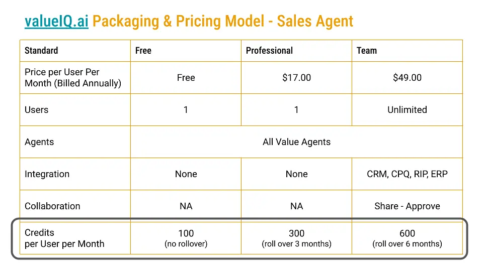 In most credit-based pricing models the buyer purchases a bucket of tokens in advance and does not pay for credits as consumed. There is generally some level of volume discount for buying tokens and in many cases different packages come with a standard number of credits. For example, valueIQ.ai provides more additional credits as one moves from Free - 100 Credits, Professional - 300 Credits, Team 600 Credits per User. For valueIQ, credit rollover also becomes more generous as one moves up tier.